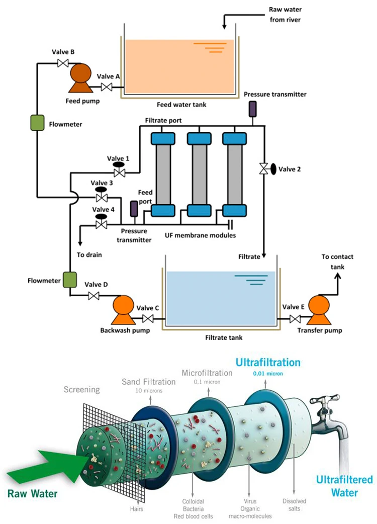 Ultrafiltration (UF) is a process that uses semi-permeable spiral wound membranes to separate and remove dissolved solids, organic,pyrogens,submicron colloidal matter,color,nitrate and bacteria from water. Feed water is delivered under pressure through the semi-permeable membrane,where water permeates the minute pores of the membrane and is delivered as purified water called permeate water.Impurities in the water are concentrated in the reject stream and flushed to the drain is called concentrate water.