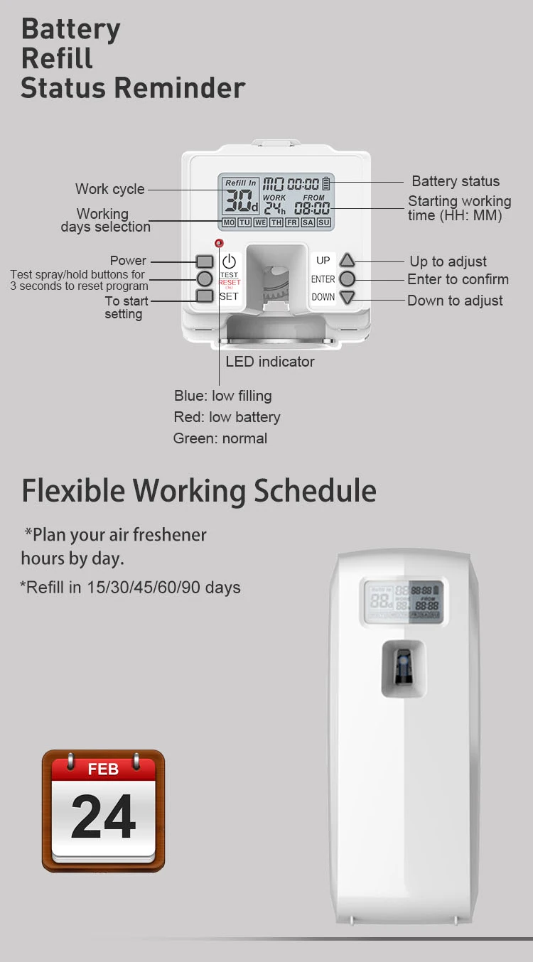 Product name | LCD Air Fresheners Dispenser/Aerosol Dispenser | Main Material | PP ABS |