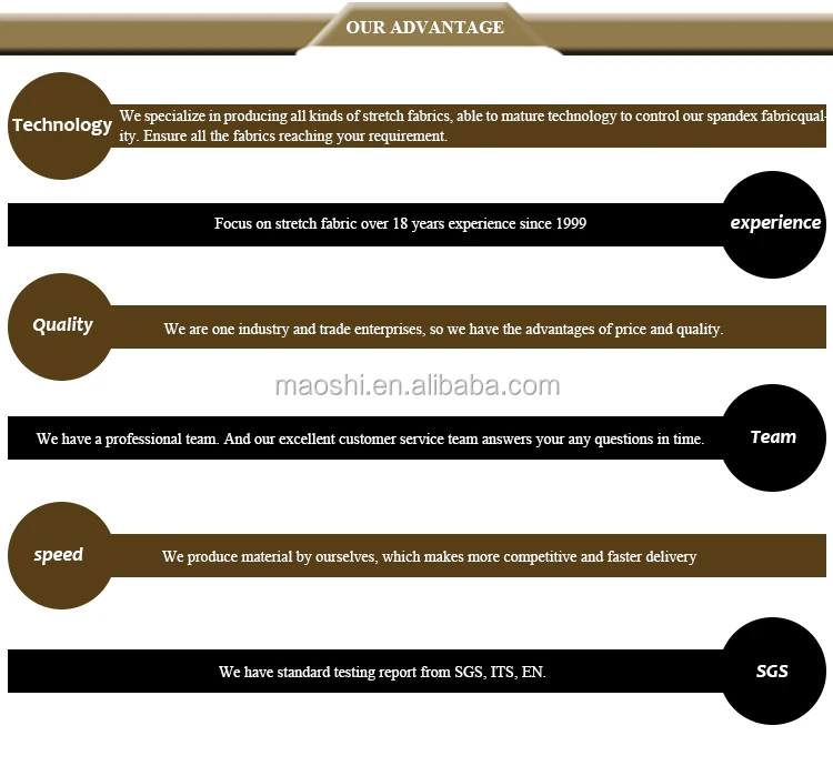 Shaoxing Mao Shi textile co., Ltd. There are 300 sets international advanced Japanese water jet looms, 100 sets Belgium air jet looms, 6 sets high-speed warping machine, 50 sets big drum twister, 50 sets Covering Spandex Machine, and 20sets high speed texturing machines. With such strong technical force, the annual output value reaches USD 14 million.We’re mainly specialized in the production of polyester and TR 4 Way Spandex fabric, and they are sold well both in overseas and domestic markets.