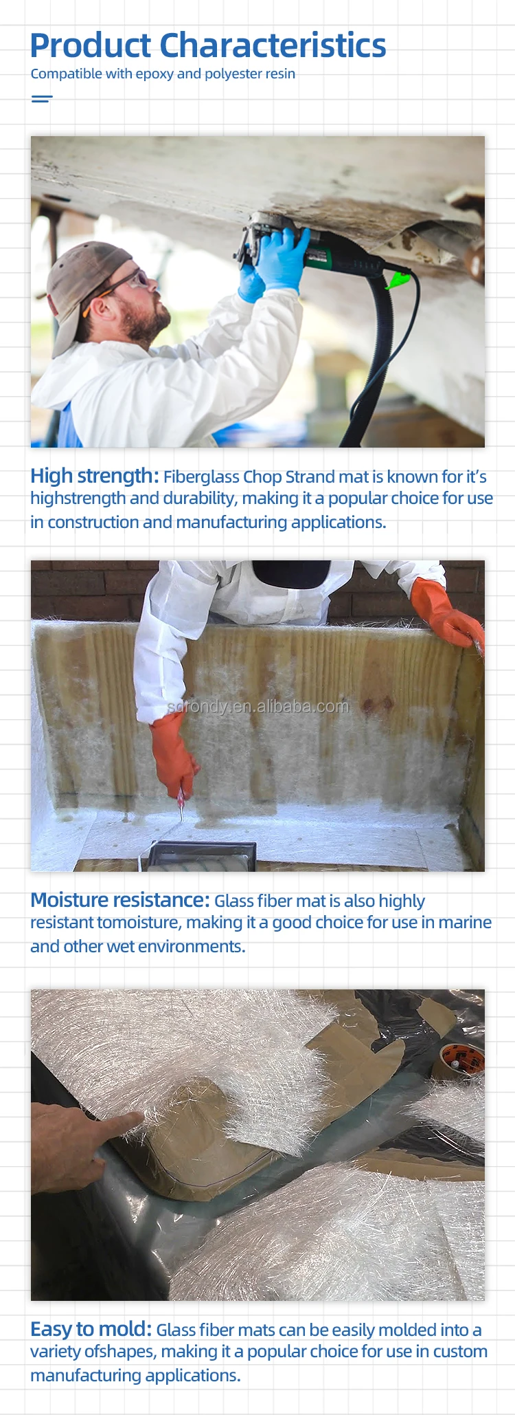 Fiberglass Chopped Strand Mat is kinds of reinforcing products that made from continuous fiberglass strand, which is chopped into a certain length, distributed in a random and non-directional position and bonded with binders. It is suitable for hand lay-up. Mold press, filament winding and mechanical forming etc., such GRP processes. The main products include kinds of panels, boats, bath equipments, automobile parts and cooling towers etc.