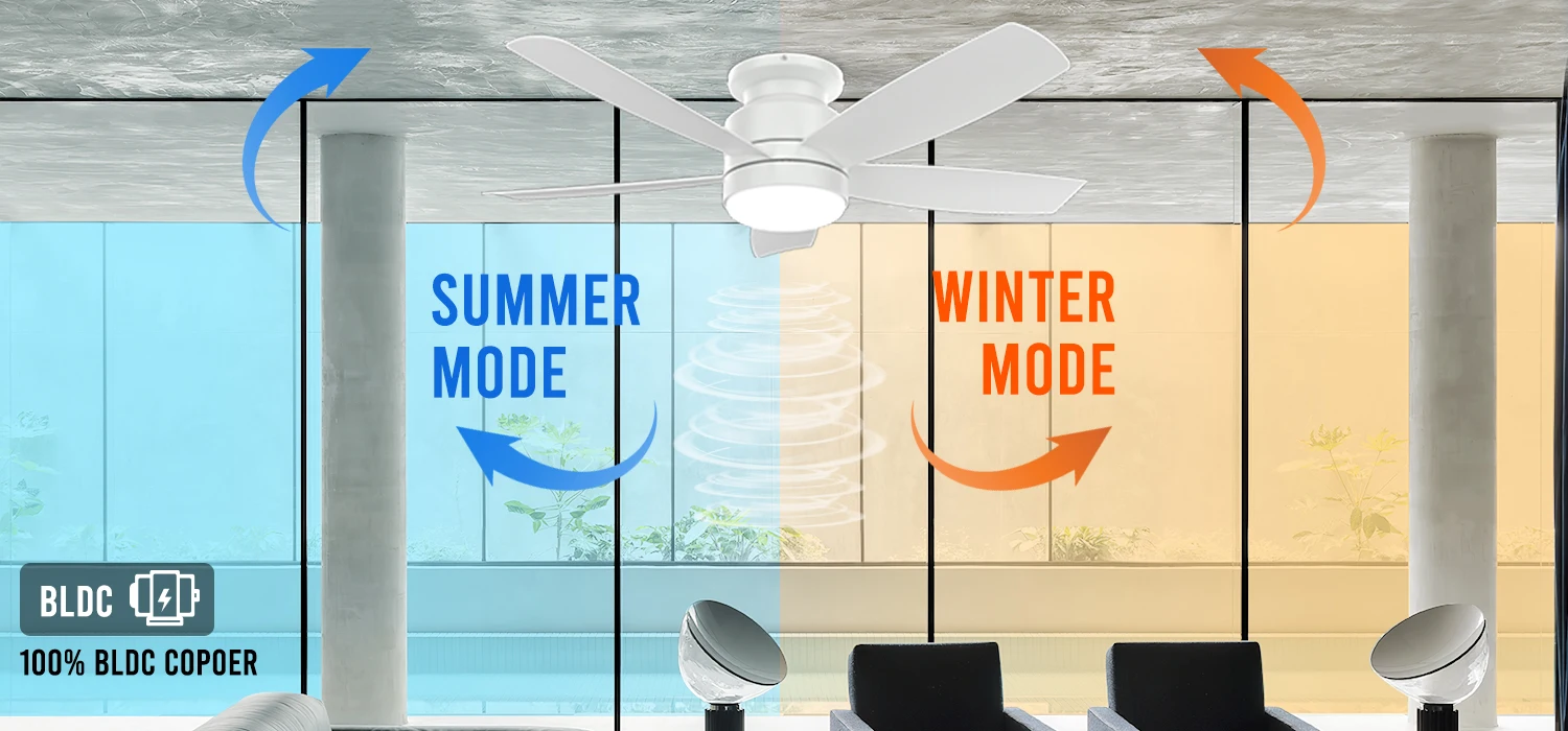 The ceiling fan with a powerful DC motor features a silent and reversible design, offering 6-speed options and an airflow of over 3000 CFM. Compared to traditional AC motors,reducing energy costs while operating smoothly and quietly. The unique design of this providing downward airflow in summer and upward airflow in winter, making it perfect for year-round use. Whether it's the hot summer or cold winter, it can create a comfortable environment for you to enjoy a pleasant experience.