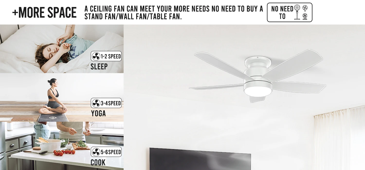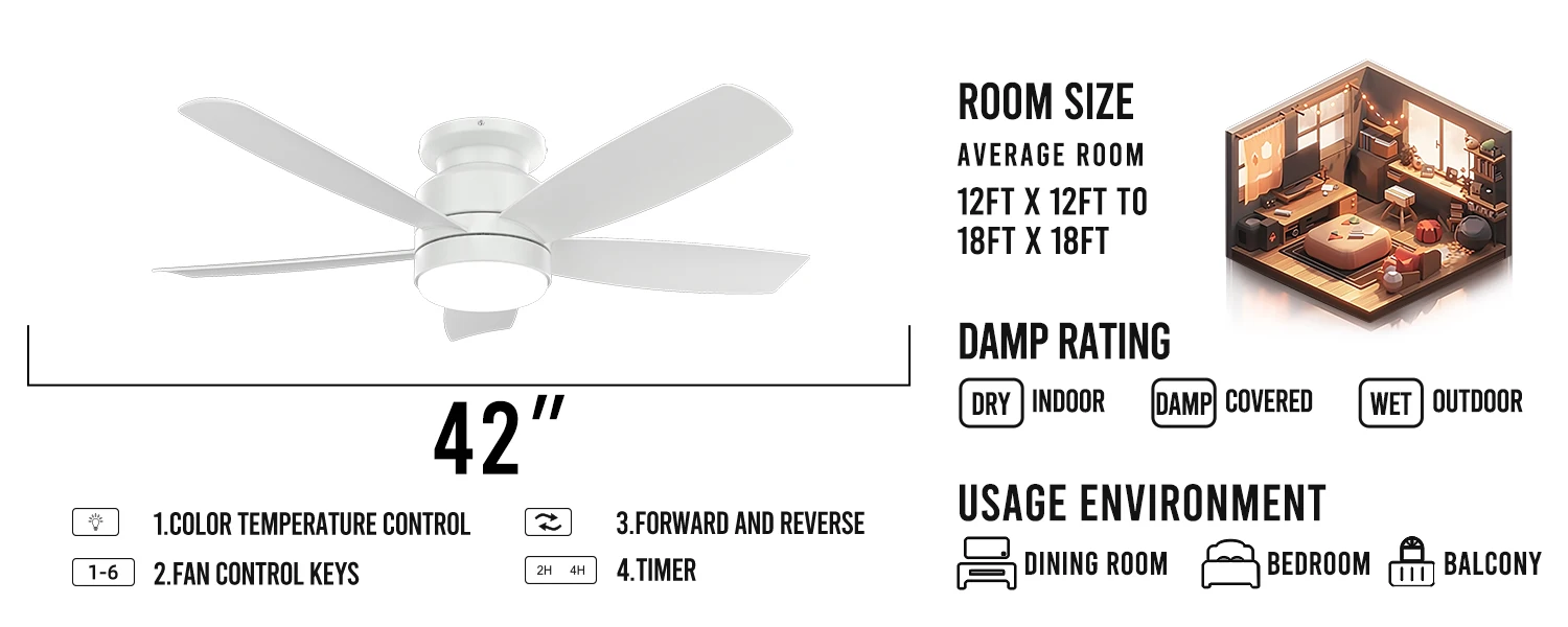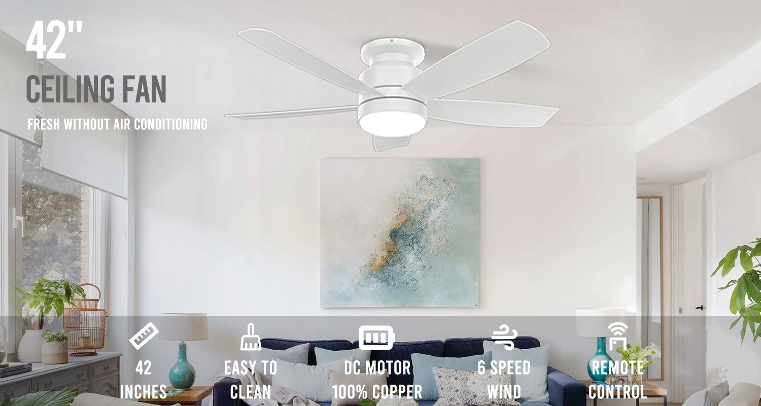 This ceiling fan is very easy to assembly, All can be easily controlled by the remote, this low profile ceiling fan features 6 speeds, timer function, forward and reverse rotation, providing you a comfortable and joyful living environment in four season.