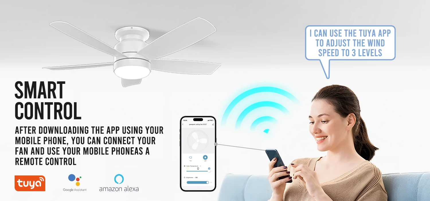 One of the key advantages of our Smart Ceiling Fan is its ability to be controlled seamlessly through Bluetooth and Wi-Fi connectivity. With just a few taps on your smartphone or voice commands, you can effortlessly adjust the fan's speed, direction,and lighting to suit your preferences. Not only does our Smart Ceiling Fan provide superior functionality, but it also offers a personalized smart solution tailored to your needs like TUYA, Google Assistant, and Amazon Alexa, you can integrate the fan seamlessly into your existing smart home ecosystem. This means you can effortlessly control the fan using voice commands or through the convenience of a single app.