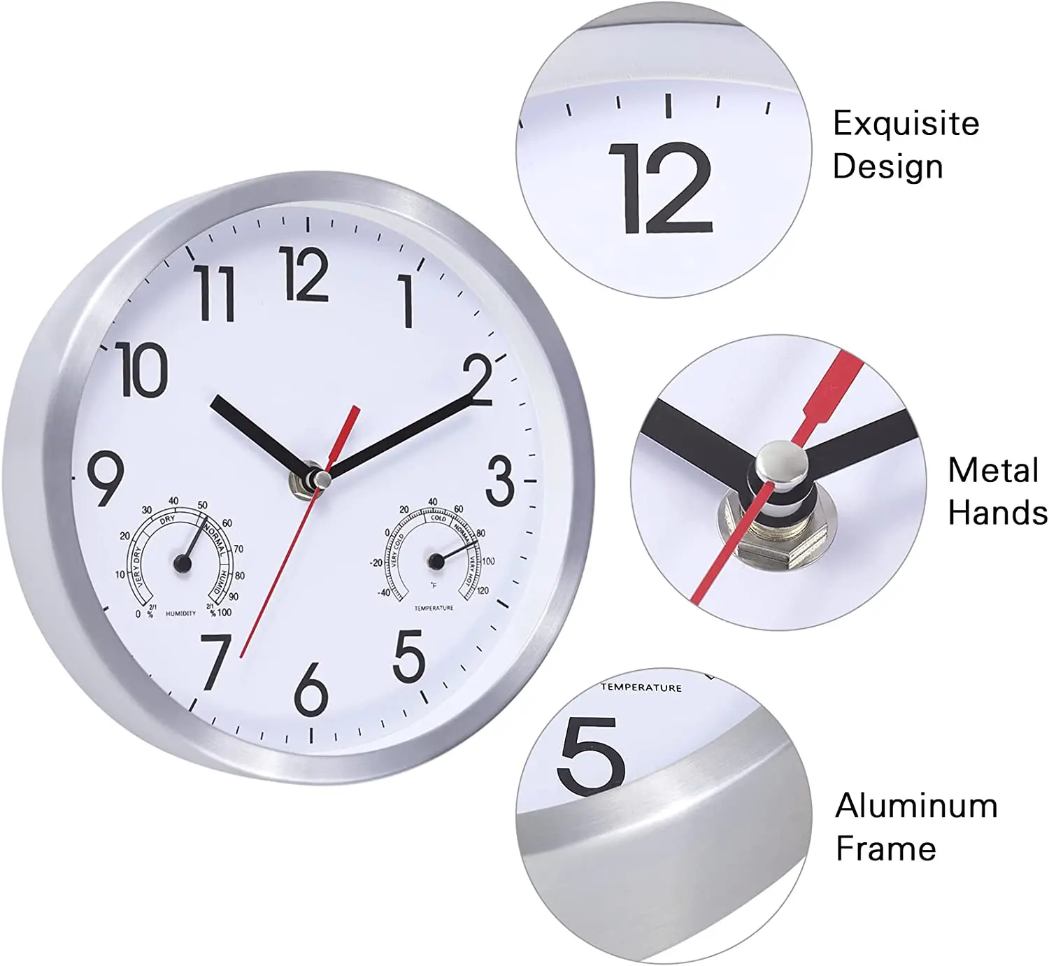 8 Inch Wall Clock with Temperature & Humidity Aluminum Frame Wall Clocks Silent Round Decorative Kitchen Living Room