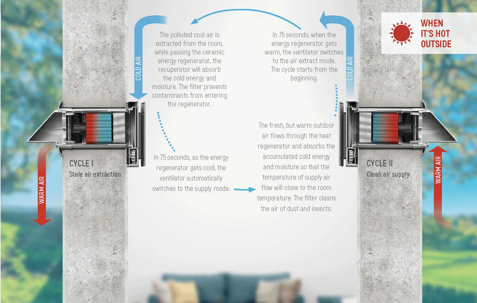 The ventilator operates in the heat recovery mode with two cycles. Two units intake/exhaust air alternately at the same time to achieve balance ventilation. It will increase the indoor comfort and make ventilation more effective. The heat and humidity in the room can be recovered during ventilating and the load on cooling system can be reduced in summer.