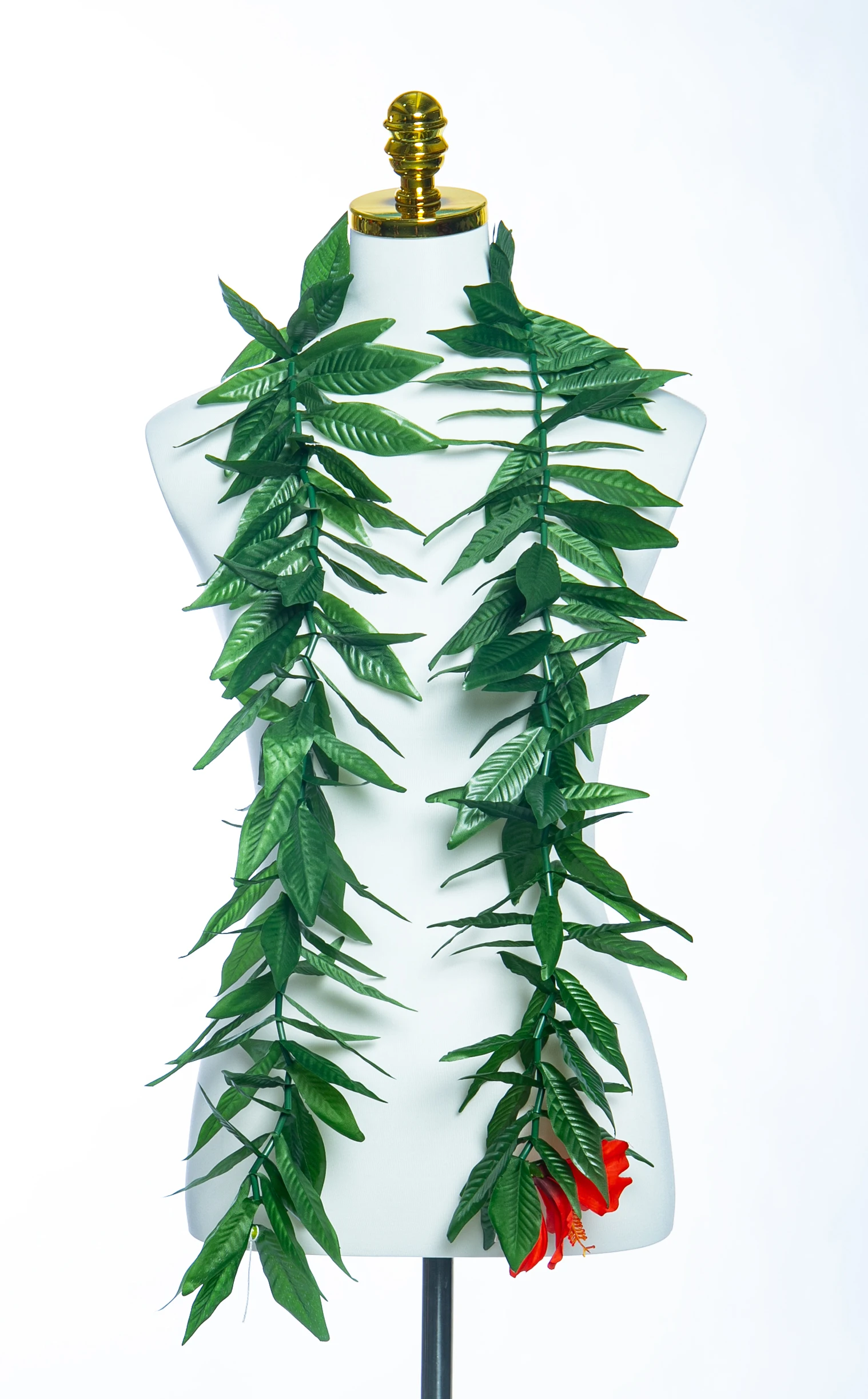 Father's Day Artificial Silk Dark Green Single Maile Leaf Lei w Hibiscus Flower Hawaii Party Wedding Celebration