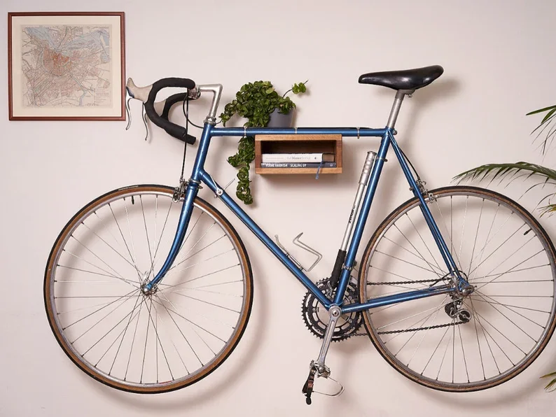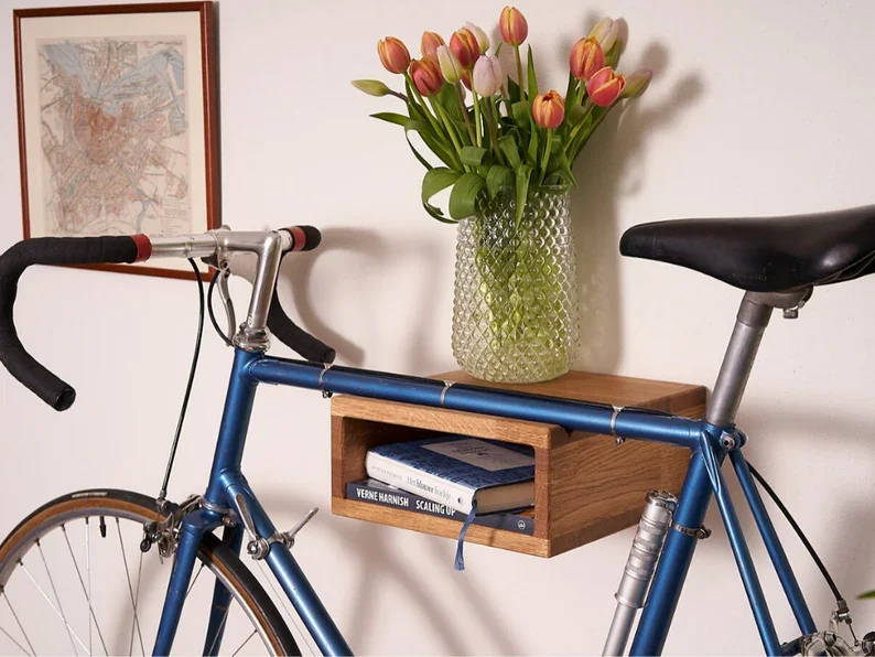 This bike stand is made of solid wood, our bike hangers can be mounted on any solid wall with no screws showing, creating a "floating" effect.