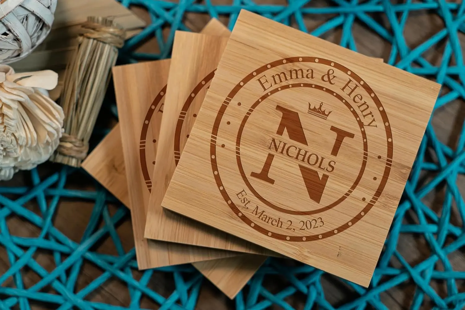 ELEGANT CUSTOMIZATION: Set of 4 bamboo coasters, personalized for Christmas, weddings, housewarmings, birthdays, new home owners, couples, friends, and family.