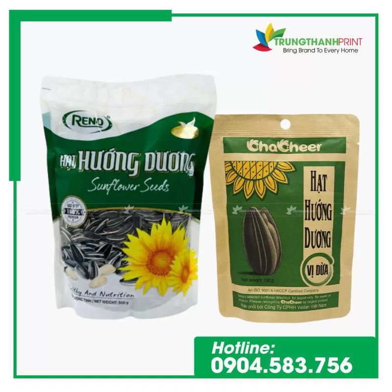 Trung Thành Print chuyên in và sản xuất bao bì đựng hạt hướng dương chất lượng tại HCM & Hà Nội, nhận thiết kế in ấn theo yêu cầu, đa dạng mẫu mã, giá xưởng.Shipping/Vận chuyển