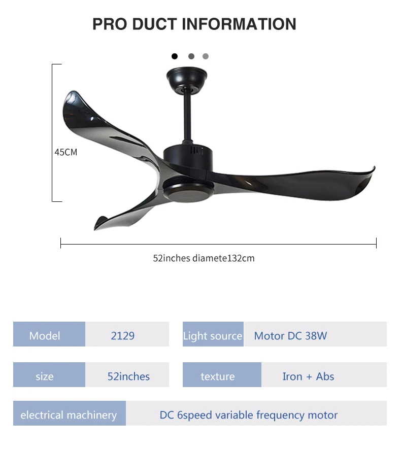 Modern Simple Style Decorative Black 5 Iron Blade 52 Inch DC Remote Control Ceiling Fan with Light