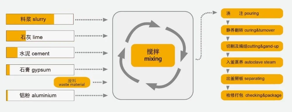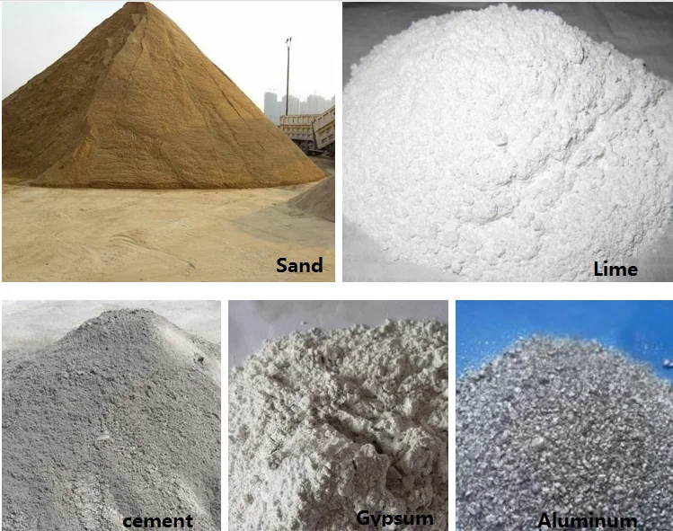 Sand (65-70%): The core raw material of AAC product; the main resource of silica-aluminum components; correspond with JC409-91, the clay should less than 4%.Lime(12-20%): One of the main raw materials of fly ash AAC; the main effect is to provide efficient calcium oxide with cooperation of cement making calcium oxide react with SiO2, Al2O3 in hot water then to produce calcium silicate hydrate. Therefore, lime is also the main resource of strength. Effective calcium oxide of lime should not less than 65%, over 80% is perfect and should accord with JC/T621-1996.
