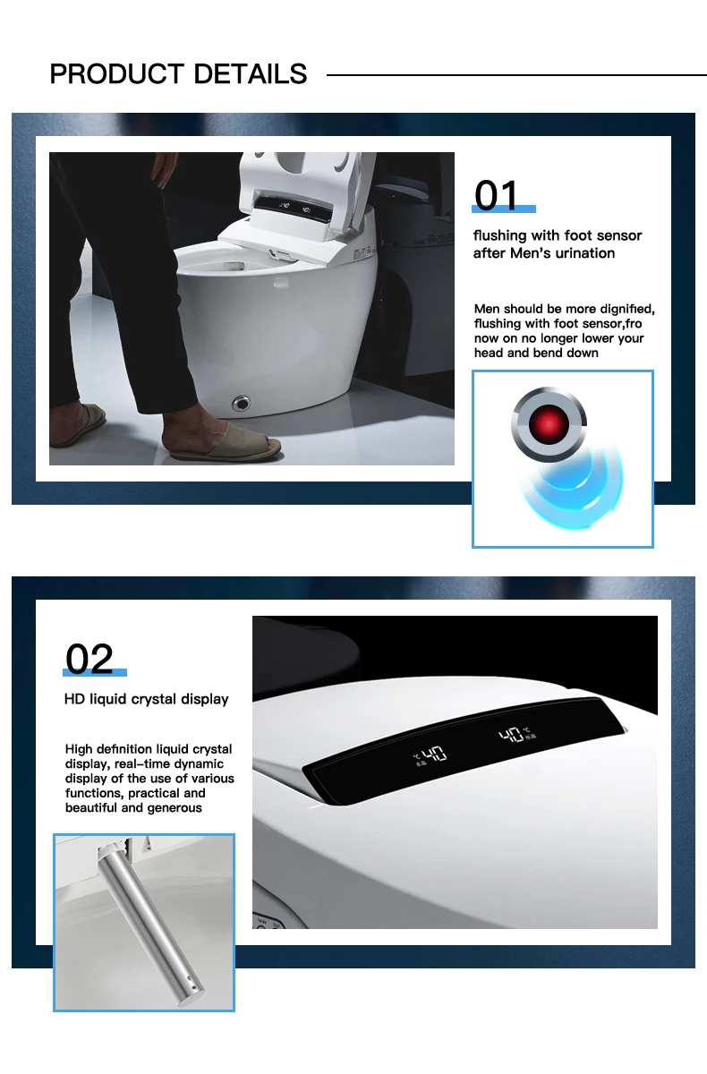 Feature | 1. Foot sentor open cover 2. No water pressure limit 3. Heated water instantly |