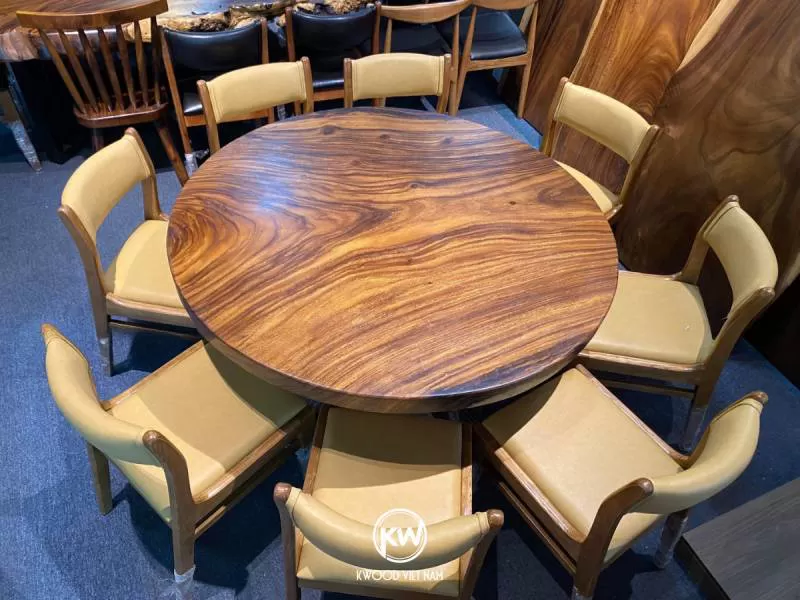 Sản phẩm bộ bàn ăn tròn gỗ me tây 8 ghế bọc nệm da cao cấp - BMT176 tại Kwood Việt Nam với kích thước đường kính 150cm và độ dày 7cm.