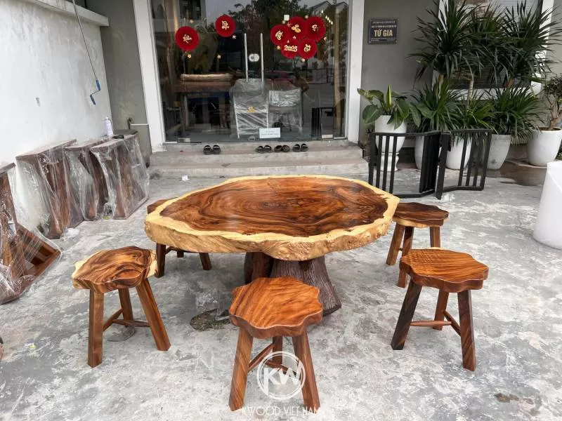 Sản phẩm Bộ bàn trà gỗ me tây nguyên tấm cao cấp - BMT161 tại Kwood Việt Nam đường kính 120cm x chiều cao 50cm x 5cm