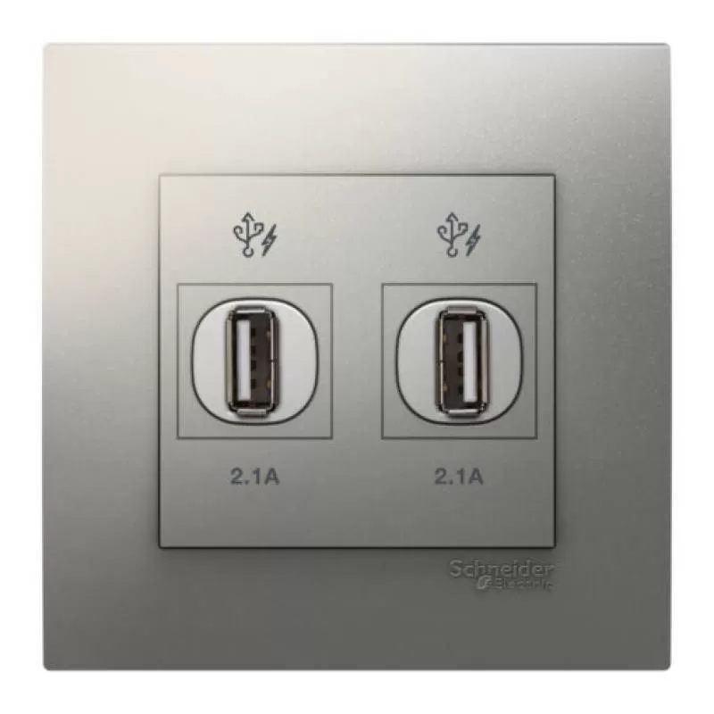 Bộ ổ cắm sạc USB đôi 2.1A, màu xám bạc, Schneider, mã KB32USB_AS_G19