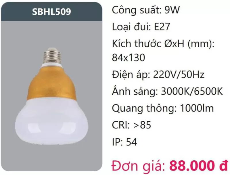Bóng LED SBHL509 Công suất: 9W Loại đui: E27 Kích thước ØxH (mm): 84 x 130 Điện áp: 220V/50Hz Ánh sáng: 3000K/6500K Quang thông: 1000lm CRI: >85 IP: 54 Xem thêm bảng giá Full: https://skyled.com.vn/bang-gia-den-duhal-moi-nhat/