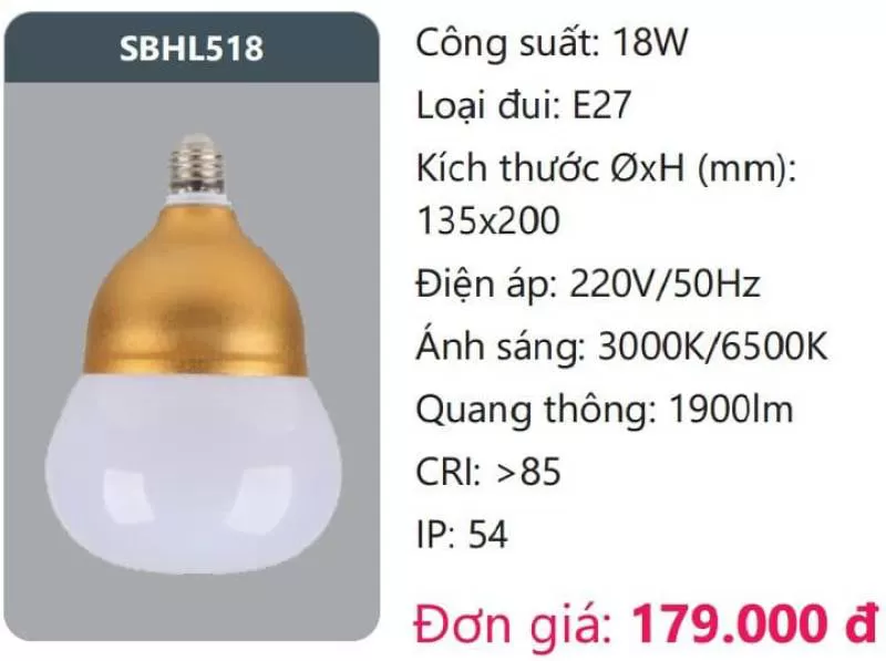 Bóng LED SBHL518 Công suất: 18W Loại đui: E27 Kích thước ØxH (mm): 135 x 200 Điện áp: 220V/50Hz Ánh sáng: 3000K/6500K Quang thông: 1900lm CRI: >85 IP: 54 Xem thêm bảng giá Full: https://skyled.com.vn/bang-gia-den-duhal-moi-nhat/