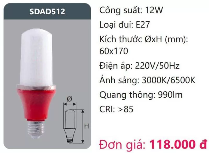 Bóng LED SDAD512 Công suất: 12W Loại đui: E27 Kích thước ØxH (mm): 60 x 170 Điện áp: 220V/50Hz Ánh sáng: 3000K/6500K Quang thông: 990lm CRI: >85 Xem thêm bảng giá Full: https://skyled.com.vn/bang-gia-den-duhal-moi-nhat/