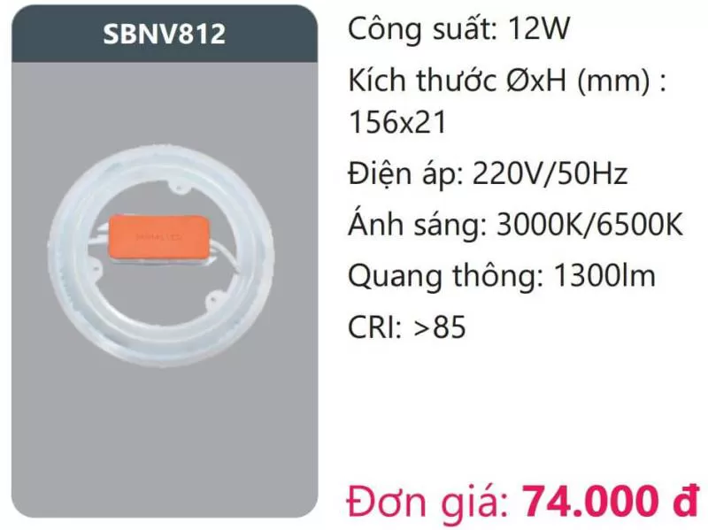 Bóng LED vòng SBNV812 Công suất: 12W Kích thước ØxH (mm): 156 x 21 Điện áp: 220V/50Hz Ánh sáng: 3000K/6500K Quang thông: 1300lm CRI: >85 Xem thêm bảng giá Full: https://skyled.com.vn/bang-gia-den-duhal-moi-nhat/