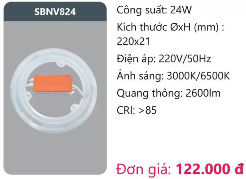 Bóng LED vòng SBNV824 Công suất: 24W Kích thước ØxH (mm): 220 x 21 Điện áp: 220V/50Hz Ánh sáng: 3000K/6500K Quang thông: 2600lm CRI: >85 Xem thêm bảng giá Full: https://skyled.com.vn/bang-gia-den-duhal-moi-nhat/