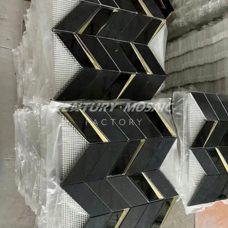 Centurymosaic Nero Marqunia Black Chevron Marble Luxury Black and Gold Mosaic Tiles