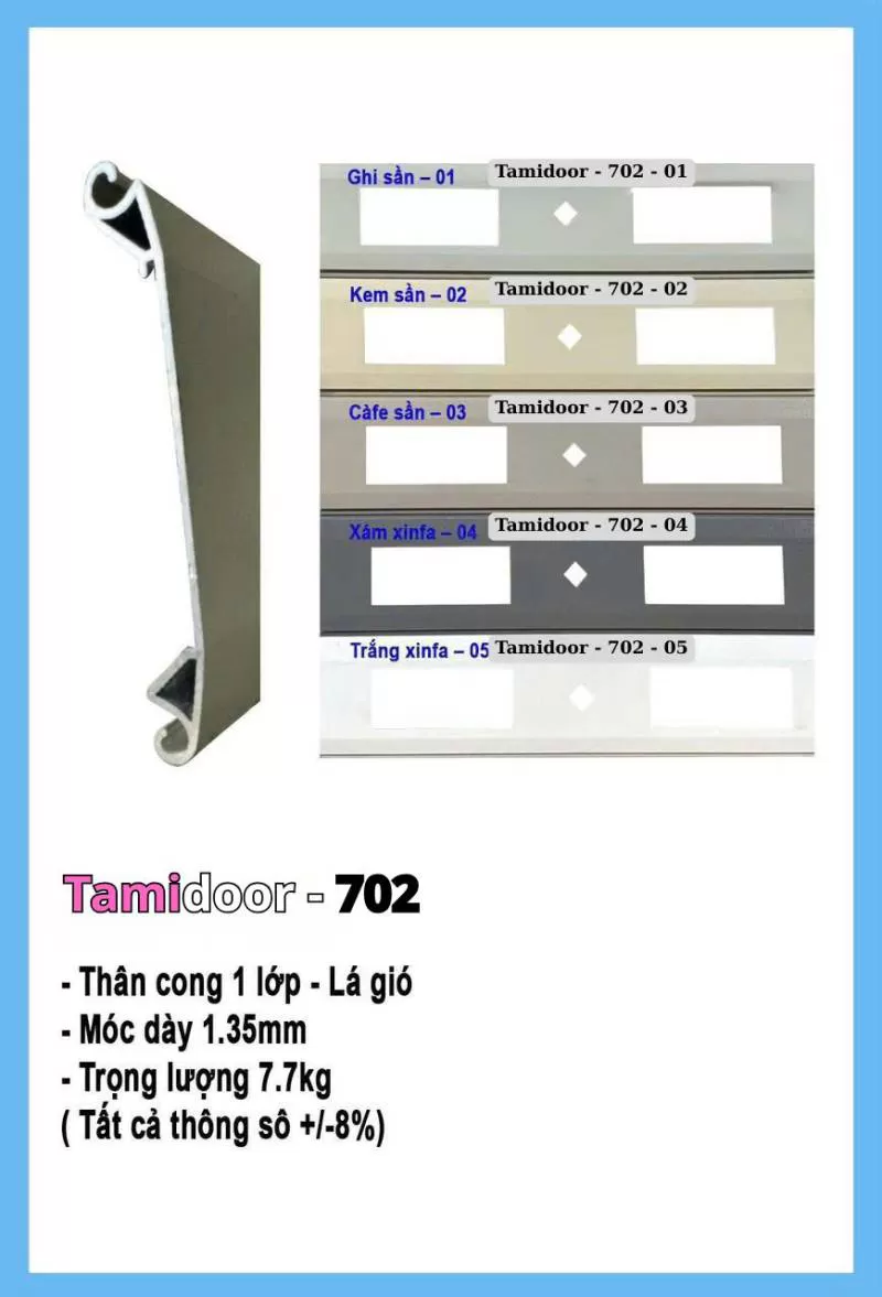 Cửa cuốn Đức 702 mẫu mới tại Tamidoor được thiết kế với thân lá cong 1 lớp kết hợp lá gió, vừa chắc chắn vừa tinh tế, phù hợp cho nhiều công trình như nhà phố, biệt thự hay showroom cao cấp. Sản phẩm được chế tạo từ hợp kim nhôm chất lượng cao, móc dày 1.35mm với trọng lượng 7.7kg/m², mang lại độ bền vượt trội.Shipping/Vận chuyển
