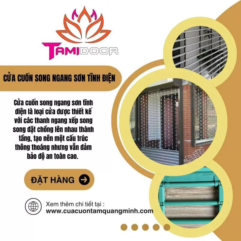 Cửa cuốn song ngang sơn tĩnh điện là dòng cửa được các gian hàng, ngân hàng lựa chọn. Với khả năng ứng dụng rộng rãi trong các công trình kiến trúc thực tế, cửa cuốn song ngang của Công Ty Cửa Cuốn Cửa Kéo Tâm Quang Minh không chỉ mang lại vẻ đẹp hiện đại mà còn đảm bảo an ninh tuyệt đối cho mọi không gian và tài sản.