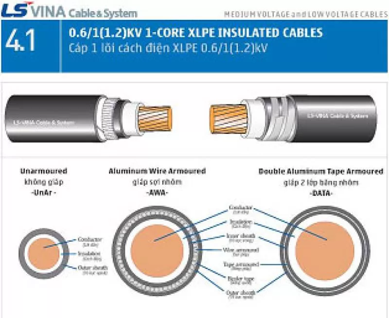 Dây cáp điện 1 lõi cách điện XLPE 0,6/1KV LS vina