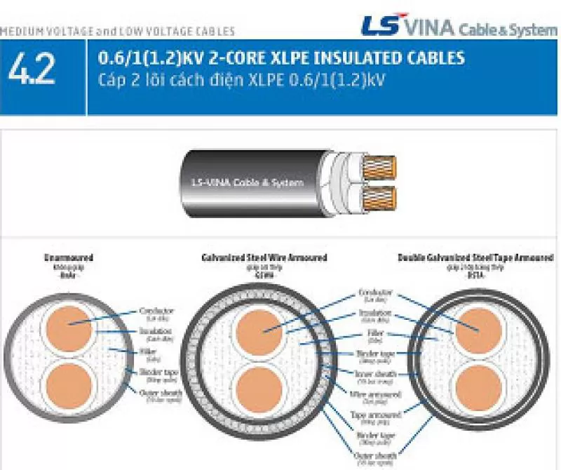 Dây cáp điện 2 lõi cách điện XLPE 0,6/1KV LS vina