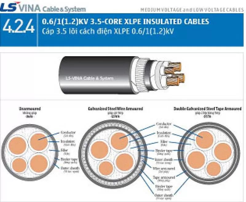 Dây cáp điện 3 lõi +1 cách điện XLPE 0,6/1KV LS vina