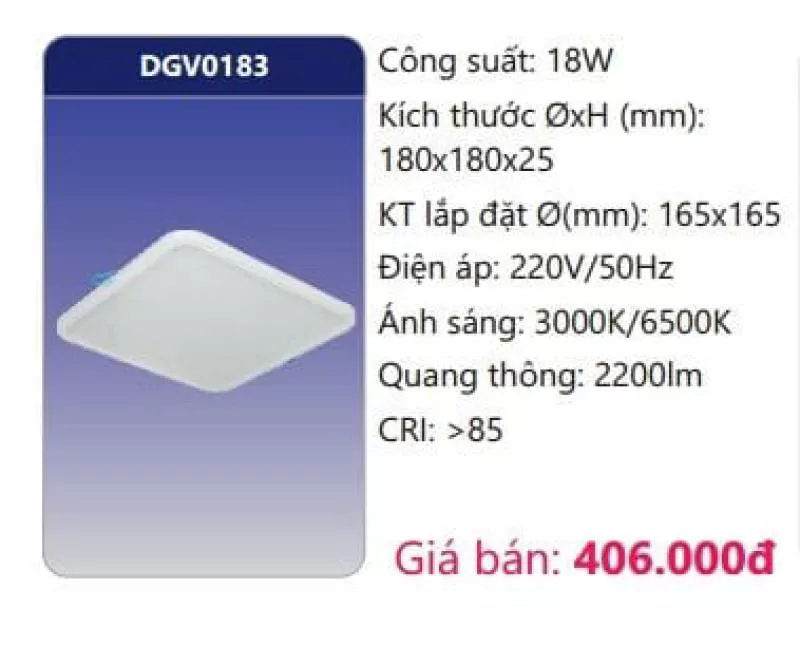 Công suất: 18W Kích thước ØxH (mm): 180 x 180 x 25 Kích thước lắp đặt (mm): 165 x 165 Điện áp: 220V/50Hz Ánh sáng: 3000K/6500K Quang thông: 2200lm CRI: >85