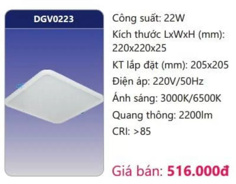 Công suất: 22W Kích thước LxWxH (mm): 220 x 220 x 25 Kích thước lắp đặt (mm): 205 x 205 Điện áp: 220V/50Hz Ánh sáng: 3000K/6500K Quang thông: 2200lm CRI: >85