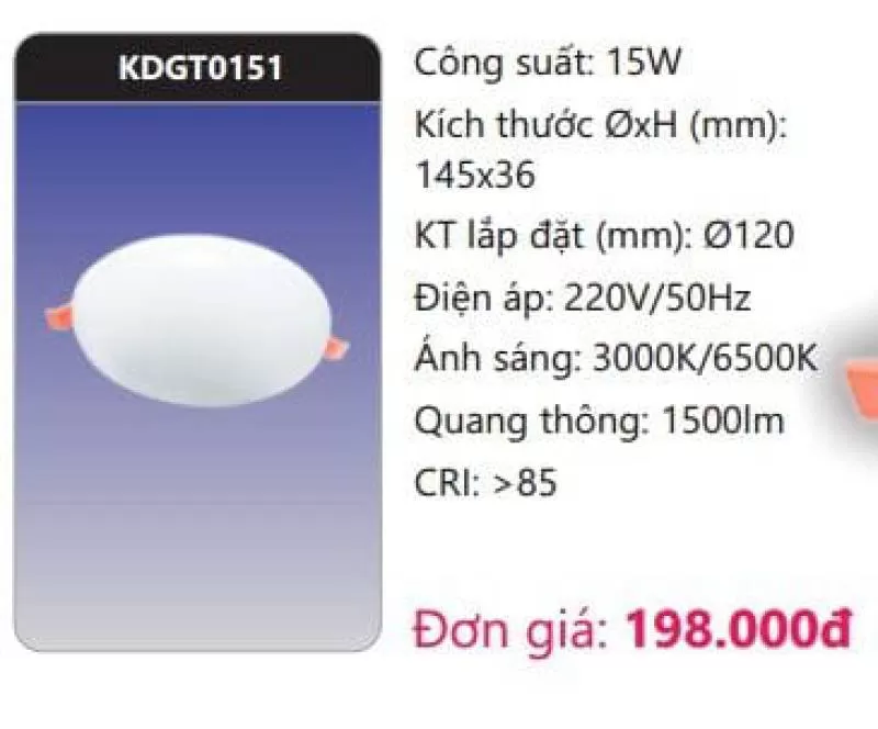 Công suất: 15W Kích thước ØxH (mm): 145 x 36 Kích thước lắp đặt (mm): Ø120 Điện áp: 220V/50Hz Ánh sáng: 3000K/6500K Quang thông: 1500lm CRI: >85