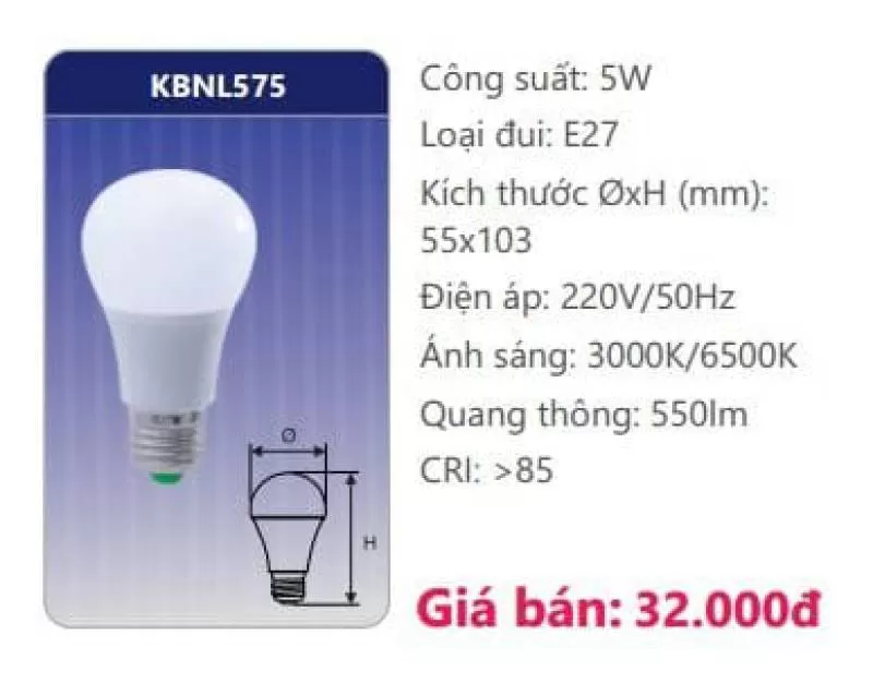 Công suất: 5W Loại đui: E27 Kích thước ØxH (mm): 55 x 103 Điện áp: 220V/50Hz Ánh sáng: 3000K/6500K Quang thông: 550lm CRI: >85
