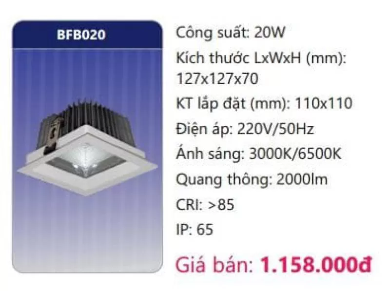 Công suất: 20W Kích thước LxWxH (mm): 127 x 127 x 70 Kích thước lắp đặt (mm): 110 x 110 Điện áp: 220V/50Hz Ánh sáng: 3000K/6500K Quang thông: 2000lm CRI: >85 IP: 65