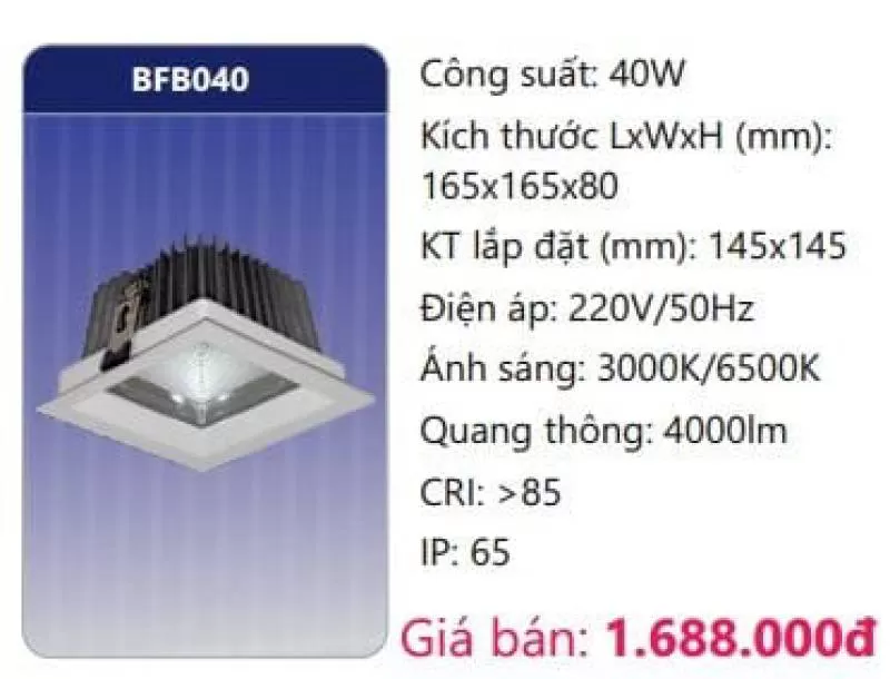 Công suất: 40W Kích thước LxWxH (mm): 165 x 165 x 80 Kích thước lắp đặt (mm): 145 x 145 Điện áp: 220V/50Hz Ánh sáng: 3000K/6500K Quang thông: 4000lm CRI: >85 IP: 65