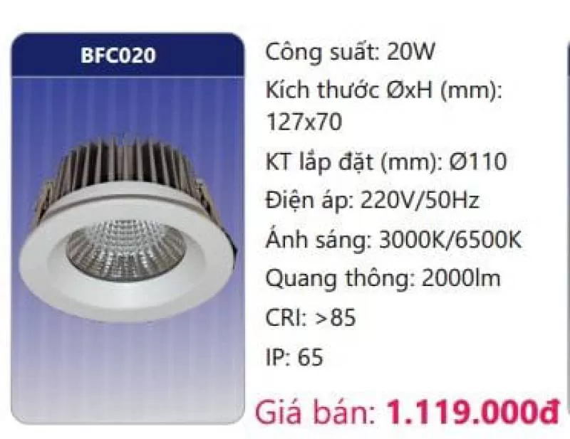 Công suất: 20W Kích thước ØxH (mm): 127 x 70 Kích thước lắp đặt (mm): Ø110 Điện áp: 220V/50Hz Ánh sáng: 3000K/6500K Quang thông: 2000lm CRI: >85 IP: 65