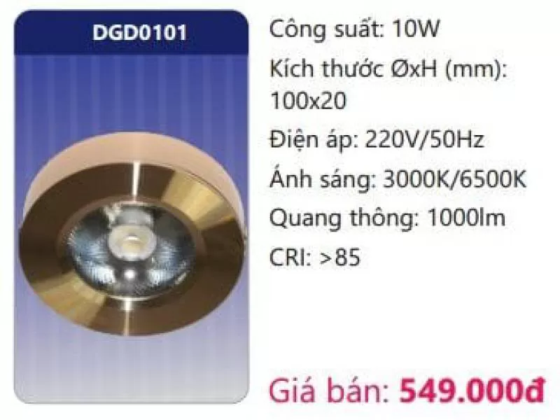 Công suất: 10W Kích thước ØxH (mm): 100 x 20 Điện áp: 220V/50Hz Ánh sáng: 3000K/6500K Quang thông: 1000lm CRI: >85