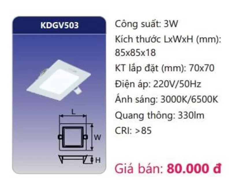 Công suất: 3W Kích thước LxWxH (mm): 85 x 85 x 18 Kích thước lắp đặt (mm): 70 x 70 Điện áp: 220V/50Hz Ánh sáng: 3000K/6500K Quang thông: 330lm CRI: >85