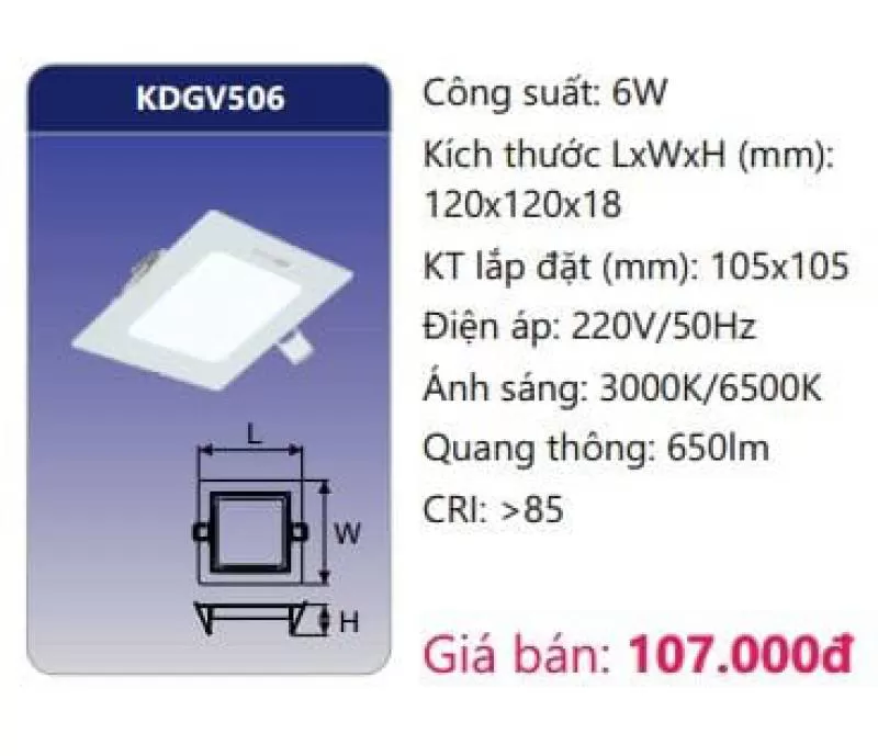 Công suất: 6W Kích thước LxWxH (mm): 120 x 120 x 18 Kích thước lắp đặt (mm): 105 x 105 Điện áp: 220V/50Hz Ánh sáng: 3000K/6500K Quang thông: 650lm CRI: >85
