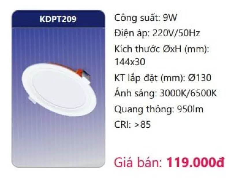 Công suất: 9W Điện áp: 220V/50Hz Kích thước ØxH (mm): 144 x 30 Kích thước lắp đặt (mm): Ø130 Ánh sáng: 3000K/6500K Quang thông: 950lm CRI: >85