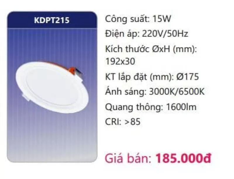 Công suất: 15W Điện áp: 220V/50Hz Kích thước ØxH (mm): 192 x 30 Kích thước lắp đặt (mm): Ø175 Ánh sáng: 3000K/6500K Quang thông: 1600lm CRI: >85