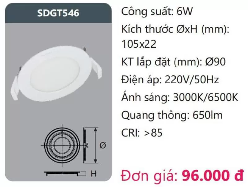 Đèn LED panel âm trần SDGT546 Công suất: 6W Kích thước ØxH (mm): 105 x 22 KT lắp đặt (mm): Ø90 Điện áp: 220V/50Hz Ánh sáng: 3000K/6500K Quang thông: 650lm CRI: >85 Xem thêm bảng giá Full: https://skyled.com.vn/bang-gia-den-duhal-moi-nhat/