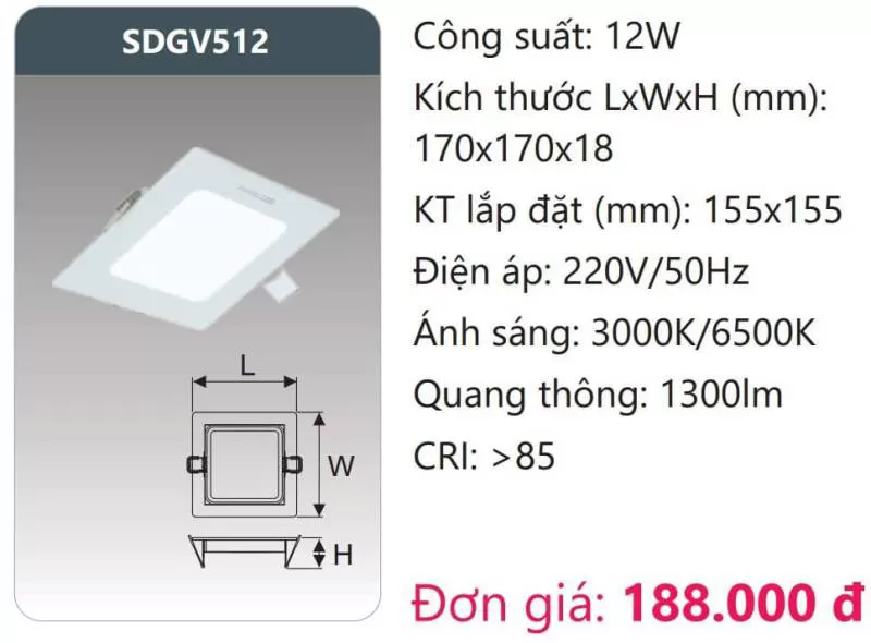 Đèn LED panel âm trần SDGV512 Công suất: 12W Kích thước LxWxH (mm): 170 x 170 x 18 KT lắp đặt (mm): 155 x 155 Điện áp: 220V/50Hz Ánh sáng: 3000K/6500K Quang thông: 1300lm CRI: >85 Xem thêm bảng giá Full: https://skyled.com.vn/bang-gia-den-duhal-moi-nhat/