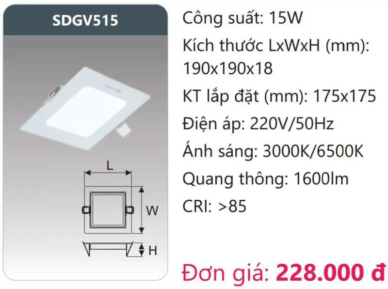 Đèn LED panel âm trần SDGV515 Công suất: 15W Kích thước LxWxH (mm): 190 x 190 x 18 KT lắp đặt (mm): 175 x 175 Điện áp: 220V/50Hz Ánh sáng: 3000K/6500K Quang thông: 1600lm CRI: >85 Xem thêm bảng giá Full: https://skyled.com.vn/bang-gia-den-duhal-moi-nhat/