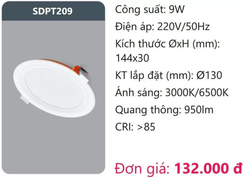 Đèn LED panel âm trần SDPT209 Công suất: 9W Điện áp: 220V/50Hz Kích thước ØxH (mm): 144 x 30 KT lắp đặt (mm): Ø130 Ánh sáng: 3000K/6500K Quang thông: 950lm CRI: >85 Xem thêm bảng giá Full: https://skyled.com.vn/bang-gia-den-duhal-moi-nhat/