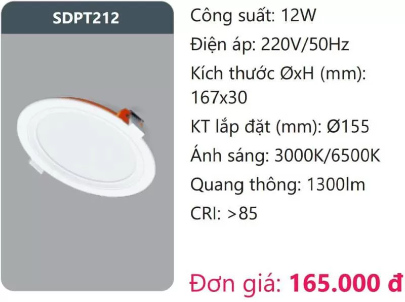 Đèn LED panel âm trần SDPT212 Công suất: 12W Điện áp: 220V/50Hz Kích thước ØxH (mm): 167 x 30 KT lắp đặt (mm): Ø155 Ánh sáng: 3000K/6500K Quang thông: 1300lm CRI: >85 Xem thêm bảng giá Full: https://skyled.com.vn/bang-gia-den-duhal-moi-nhat/