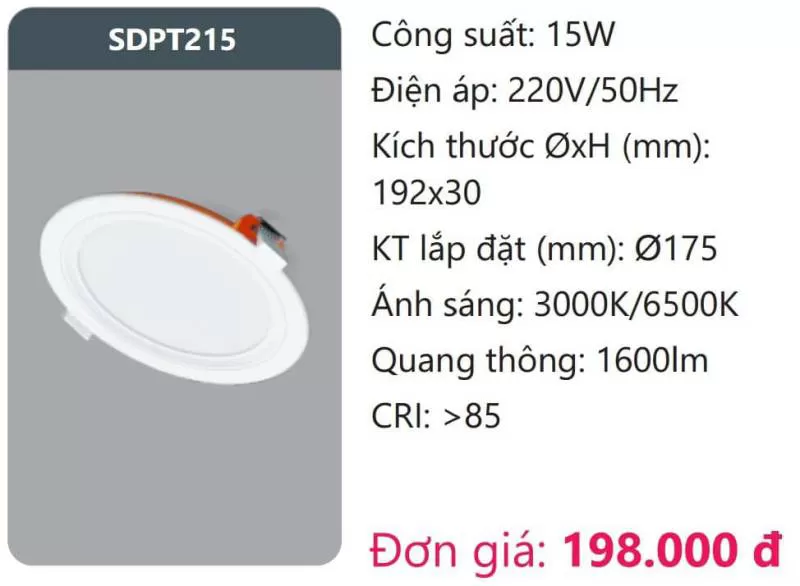 Đèn LED panel âm trần SDPT215 Công suất: 15W Điện áp: 220V/50Hz Kích thước ØxH (mm): 192 x 30 KT lắp đặt (mm): Ø175 Ánh sáng: 3000K/6500K Quang thông: 1600lm CRI: >85 Xem thêm bảng giá Full: https://skyled.com.vn/bang-gia-den-duhal-moi-nhat/
