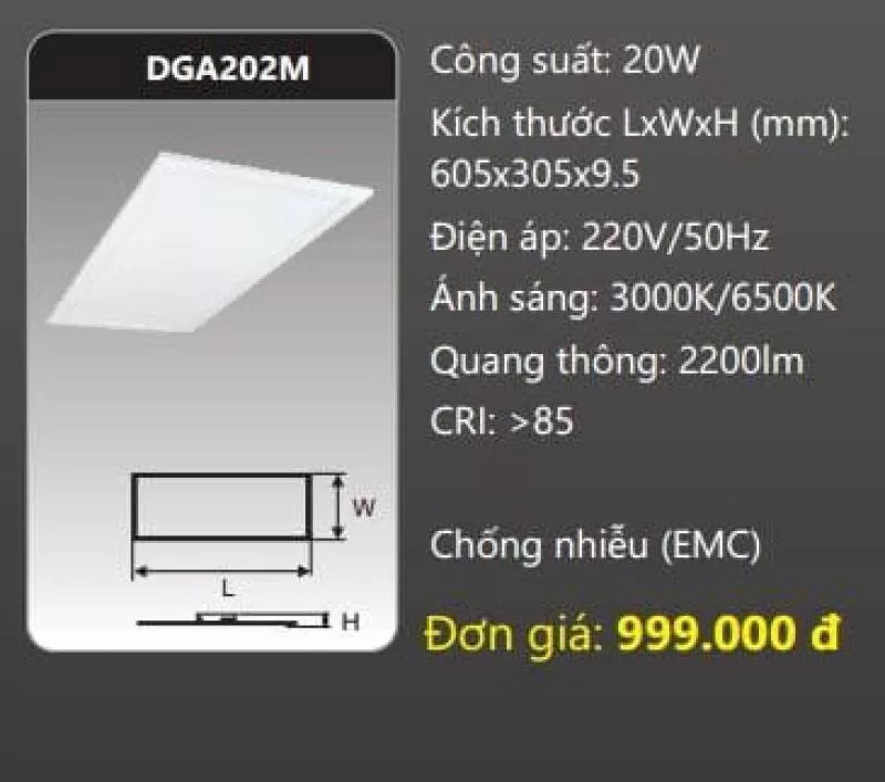 Đèn LED panel bảng DGA202M Công suất: 20W Kích thước LxWxH (mm): 605 x 305 x 9.5 Điện áp: 220V/50Hz Ánh sáng: 3000K/6500K Quang thông: 2200lm CRI: >85 IP: 44 Chống nhiễu (EMC)