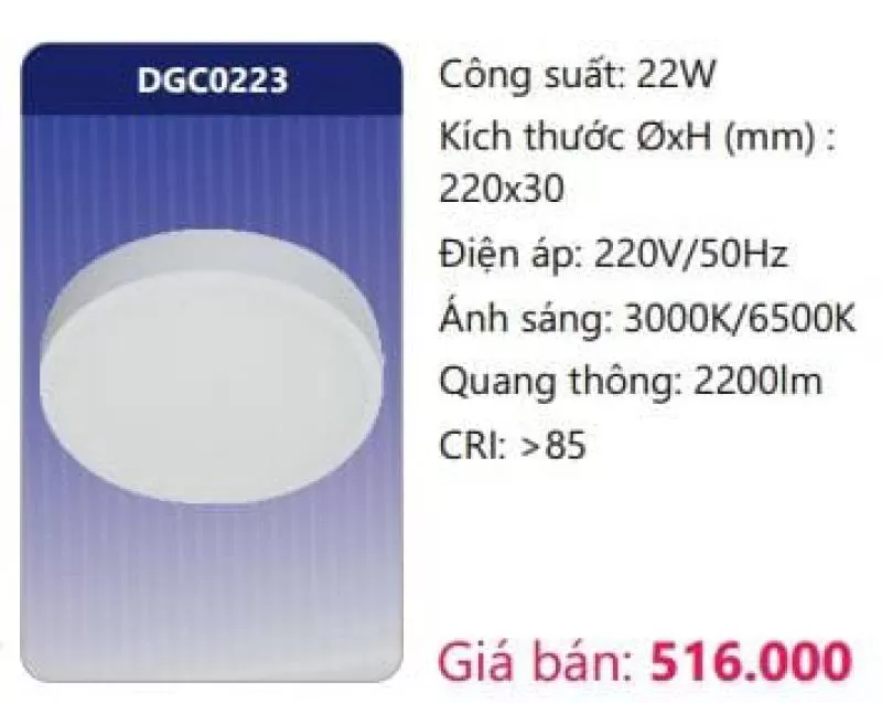 Công suất: 22W Kích thước ØxH (mm): 220 x 30 Điện áp: 220V/50Hz Ánh sáng: 3000K/6500K Quang thông: 2200lm CRI: >85